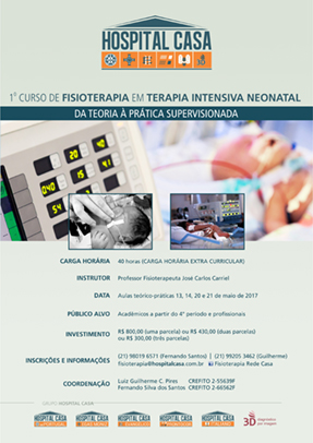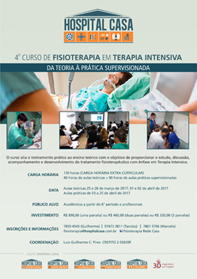 As inscrições estão abertas. O público alvo desse curso é o profissional de fisioterapia que deseja o aperfeiçoamento teórico-prático para a aplicação dos conceitos e aprendizados técnicos adquiridos na graduação. As aulas práticas acontecerão dentro dos CTIs do GRUPO HOSPITAL CASA. O material didático será incluso e os alunos terão direito a um certificado, para quem concluir, pelo menos, 75% das aulas. O setor de Fisioterapia do GRUPO, desde 2009, vem ministrando treinamentos práticos de excelência, colaborando com a formação profissional e cada vez mais proporcionando o engrandecimento da Fisioterapia e seus profissionais.