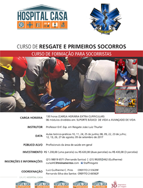 O Curso de Resgate e Primeiros Socorros em toda sua extensão, visa ao desenvolvimento das aptidões necessárias para um atendimento imediato eficaz à vítima, conscientizar leigos e aperfeiçoar profissionais da área de saúde da importância do aprendizado, do treinamento e da prevenção contra acidentes. O curso é enriquecido com simulações e muitas práticas bem próximas da realidade, visando formar socorristas resgatistas para atuarem em unidades de emergência e serviços especializados. Curso de Formação está de acordo com a Portaria 2048/GM e será certificado pelo Centro de estudos do GRUPO HOSPITAL CASA e pela STAFF – Resgate Curso e Treinamentos Ltda. O público alvo deste curso são os profissionais de saúde em geral; condutores de veículos de emergência; profissionais da área de segurança pública ou privada; Brigadistas de Emergência; pessoas leigas com interesse em resgate e salvamento em suporte básico de vida.
